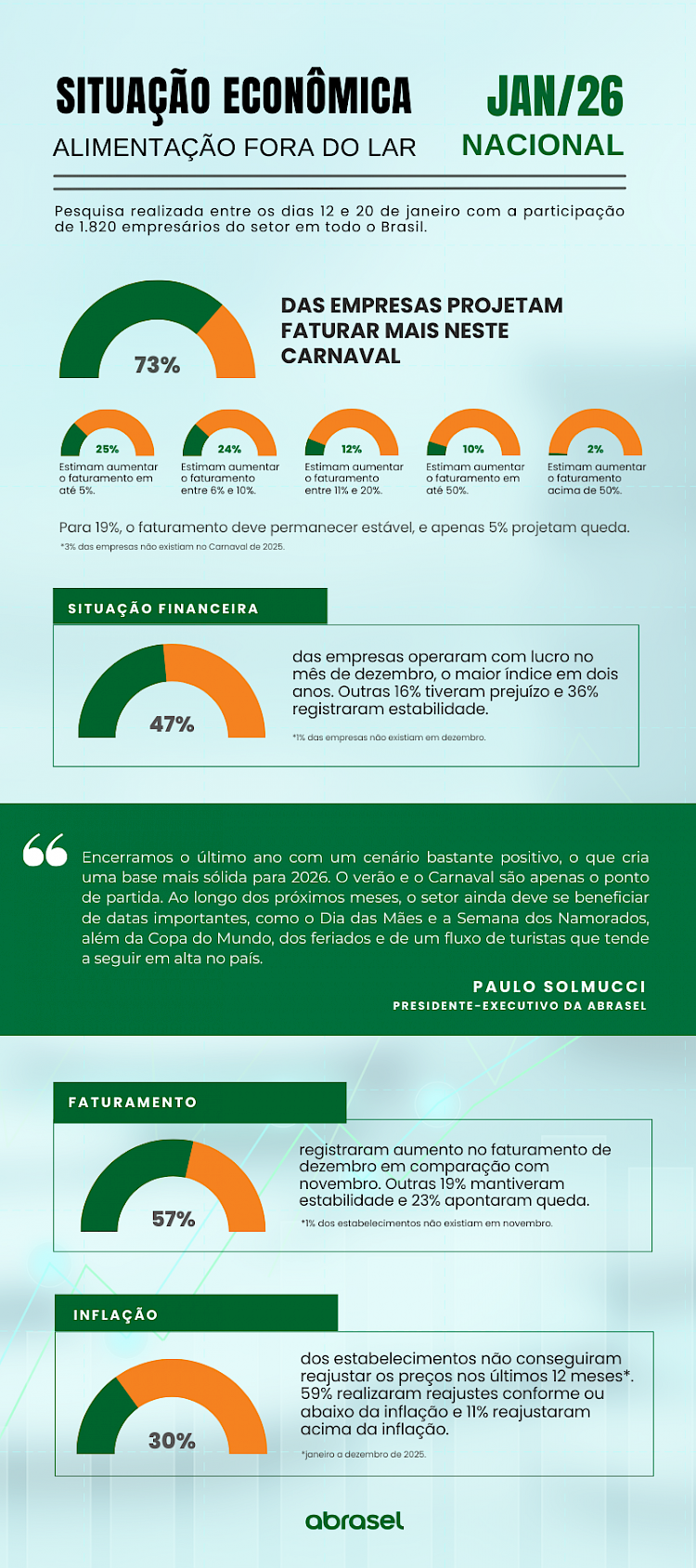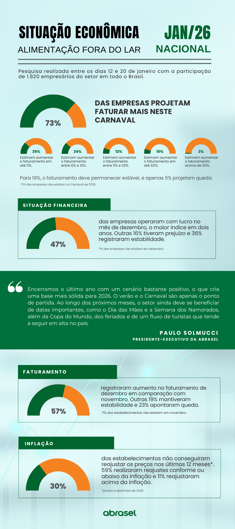 Além disso, a pesquisa indicou que, na comparação entre dezembro e novembro de 2025, 57% dos respondentes registraram faturamento maior, 19% mantiveram estabilidade e 23% tiveram queda. Já em relação aos reajustes de preços, 59% conseguiram ajustar o cardápio conforme ou abaixo da inflação e 11% reajustaram acima do índice inflacionário. Outros 30% afirmaram não conseguir realizar qualquer reajuste.
