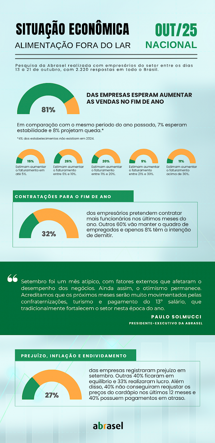 O setor de alimentação fora do lar tem boa expectativa para os últimos meses do ano. Segundo levantamento da Abrasel, 81% dos empreendedores esperam ter alta no faturamento em comparação com o mesmo período do ano passado. Para a maioria (26%) o aumento deve ser de pelo menos 10%.